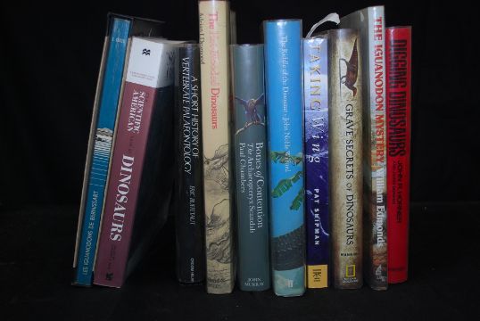 Dinosaurs and prehistoric life to include : Bones Of Contention;The Archaeopteryx Scandals by Paul Chambers, Digging Dinosaurs by John R. Horner, The Riddle Of The Dinosaur by John Noble Wilford, The Iguanadon History by William Edmonds, Taking Wing by Pat Shipman, Les Iguanadons de Bernissart by E. Casier, The Hot-Blooded Dinosaurs by Adrian Desmond. 10 hardbacks in total.