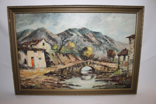 A 20th century continental oil on canvas painting of a village scene together with a David Shepherd Elephant print and another