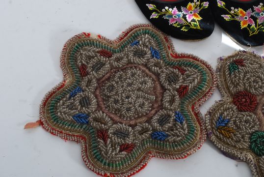A pair of woodland 19th century Ameican Indian beaded roundels together with a pair of beaded slippers circa Victorian period