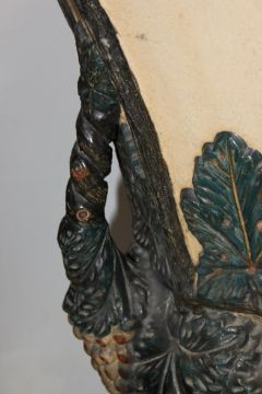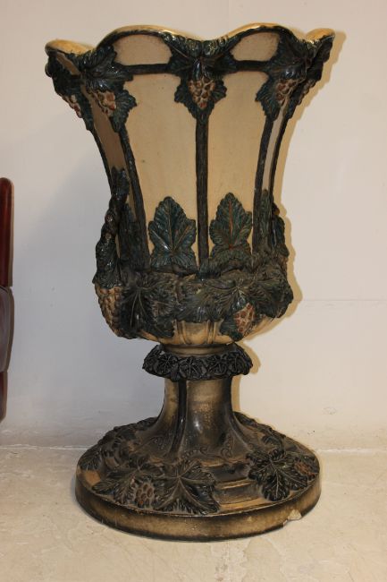 A very large floor standing 19th century Majolica style glazed stoneware garden planter urn raised on circular plinth. 64cm diameter, 109cm tall.