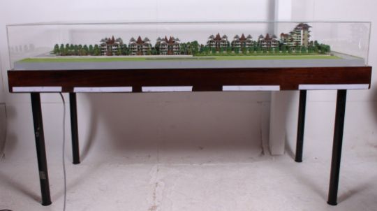 A large architectural / architects model of a Malaysian village complete complete with electrics with the houses and pools lighting up. Set within the original large acrylic and hardwood case with removable legs / Ideal as a model display case / shop display haberdashery alternative use