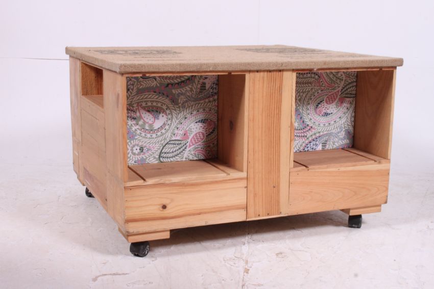 An unusual scratch built Industrial style coffee table constructed from wine boxes having hessian sack top cover all raised on castors. Measures: 51cms x 82cms x 75cms.