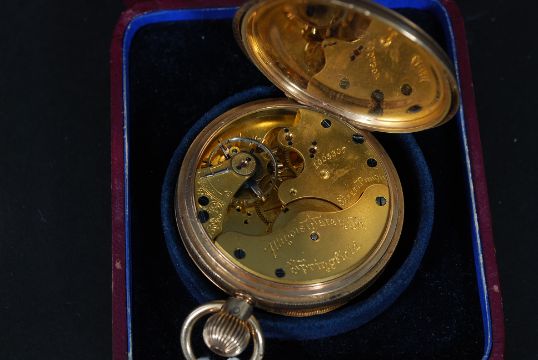 An American 10ct gold pocket watch by Illinois Watch Company, Springfield, USA. THe movement marked 1005307. The enamel dial with subsiduary seconds dial. Gross Weight 86.9g
