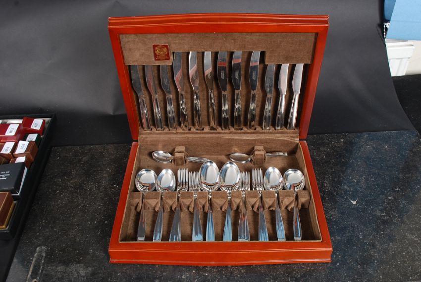 A good 20th century mahogany cased canteen of cutlery in the original presentation box having lined interior