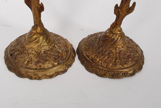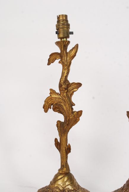 A pair of good quality gilded metal rococo table lamps having terraced bases with trig stems and electric sconces atop