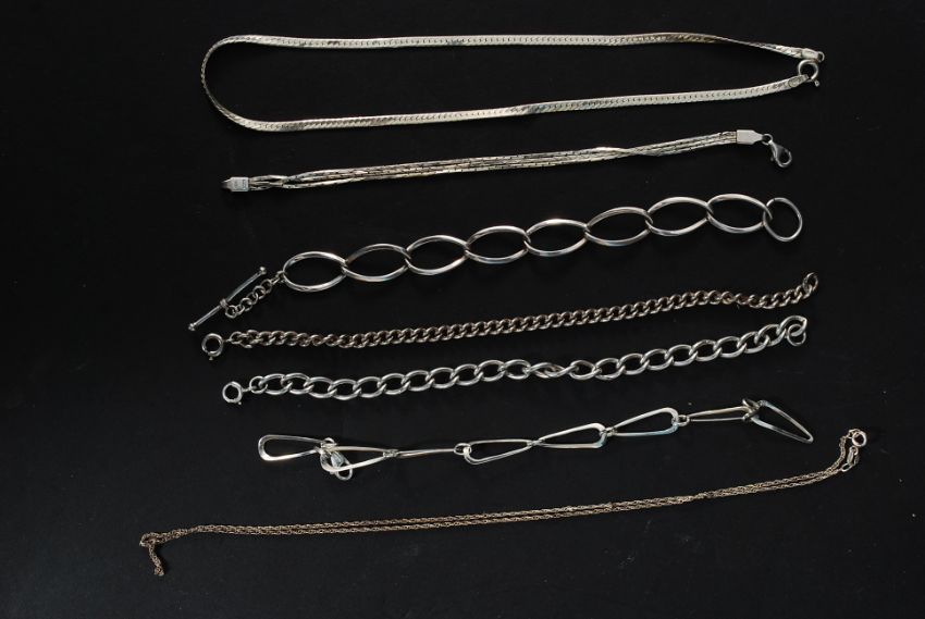 A collection of 5 silver 925 ladies bracelets together with 2 fine silver 925 necklaces ( see illustration ). Measures: 48g