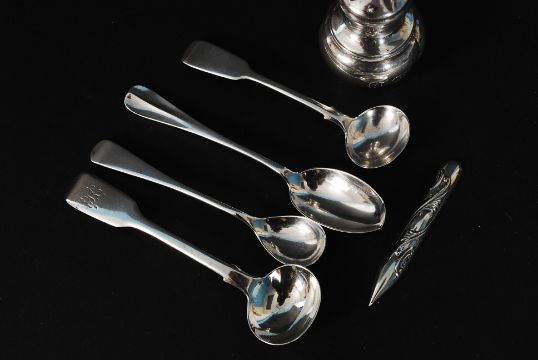 A collection of hallmarked silver items to include 4x silver spoons, condiment shaker and a nail file / letter opener. Measures:74g.