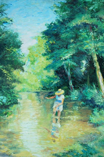 COOTE, MICHAEL; A signed, gilt framed oil on canvas scene of a woman wading in a river 73 cm x 60 cm Michael Coote studied as a photo lithographer, and is often credited as 'colour illustrator' on contemporary Sherlock Holmes publications.