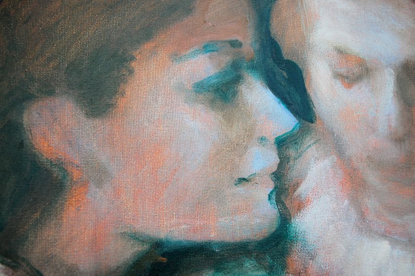 COOTE, MICHAEL; An unframed oil on canvas two figure portrait study. 61cm x 61cm Michael Coote studied as a photo lithographer, and is often credited as 'colour illustrator' on contemporary Sherlock Holmes publications.