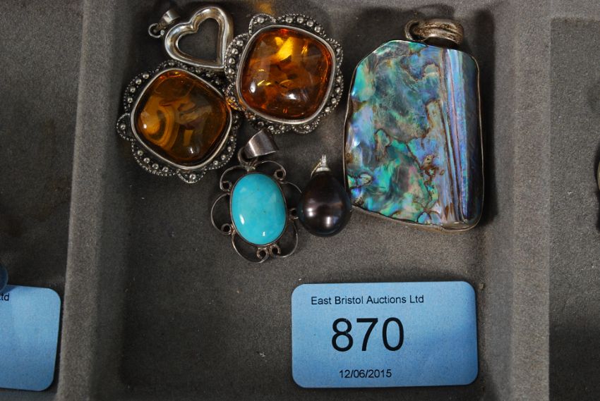 A collection of ladies silver pendants to include mother of pearl inset large pendant, turquoise set , heart shape, pearl etc together with 2 amber set silver clip brooches. Total weight 27.6g