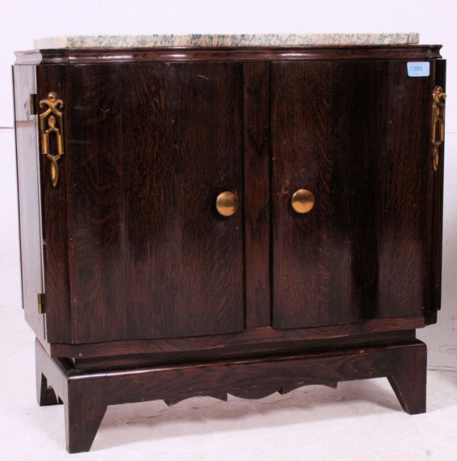 A pair of 1930's Art Deco walnut and marble bedside cabinets raised on angular plinths with twin doors having embellished designs with veined marble tops. Measures: 60cm x 63cm x 30cm.