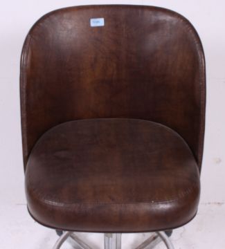 An original 1970's Samsonite Industrial faux leather and chrome office / desk swivel chair being raised on quadruped base with brown upholstered faux leather seat and back rest. Measures: 87cm x 50cm x 45cm.