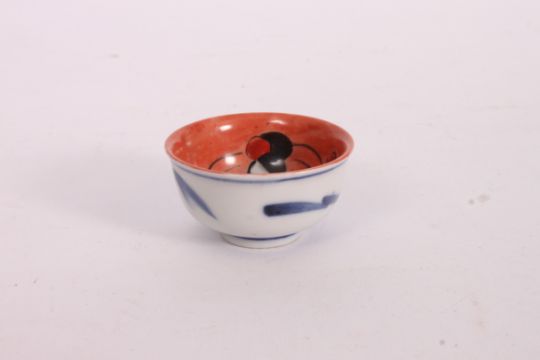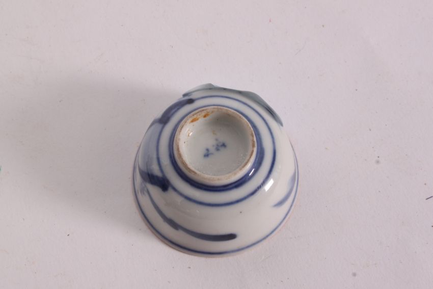 A late 19th / early 20th century Chinese oriental small bowl / cup. The inside hand painting depicting an oriental figure playing an instrument. The exterior of the porcelain painted in blue and white with a character mark to the base.