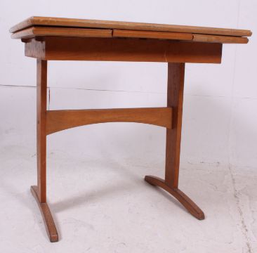 A stunning 1950's formica and beech wood vintage / retro draw leaf dining table with applied original green/blue formica top above. Measures: 77cm x 78cm x 78cm.