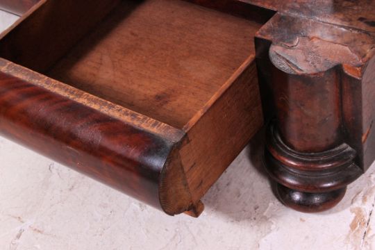 A 19th century Victorian toilet swing mirror in flame mahogany having plinth base with trinket drawers. The mirror on scrolled arms with swing mirror to centre. Measures: 70cm x 56cm x 28cm.