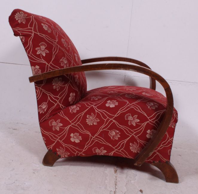 A stunning 1930's Art Deco French bentwood upholstered armchair. The bentwood oak arms flanking a stunning upholstered seat and back rest all being raised on angled legs