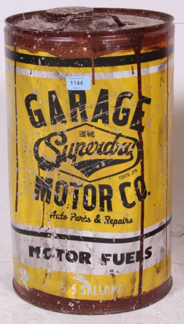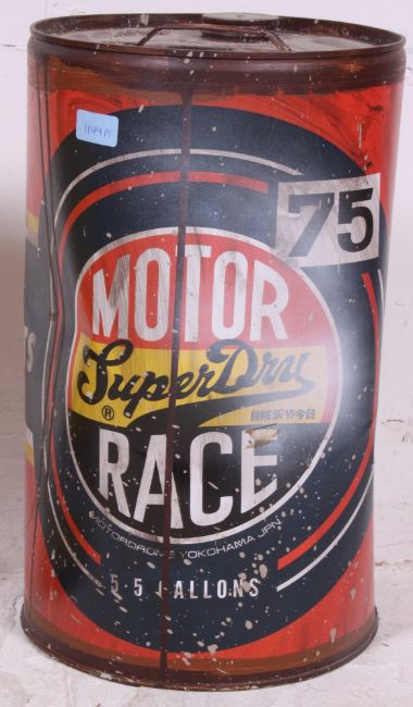 2 vintage style Superdry oil canisters / barrels of shabby chic painted / dented form, one red and one yellow. Measures: 47cm x 28cm.