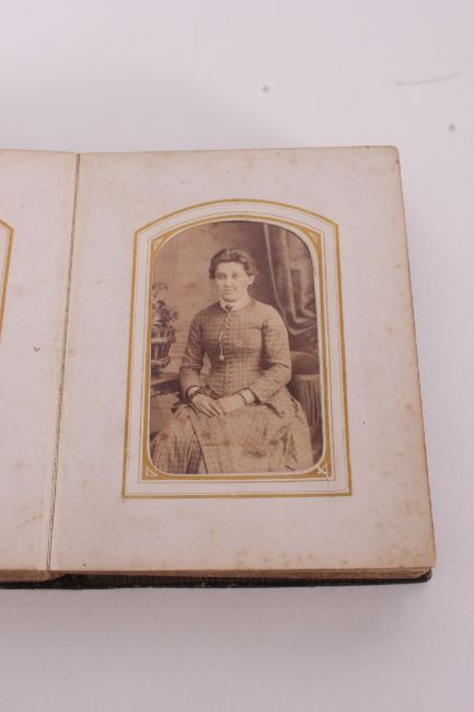 A Victorian Carte De Vista / postcard album featuring several cabinet photographs and postcards.