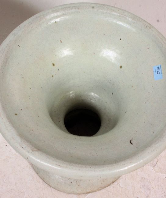 Two 20th century large stoneware planters of tapering form. In white , with tubular banding to the stems. Measures: 42cm x 48cm.