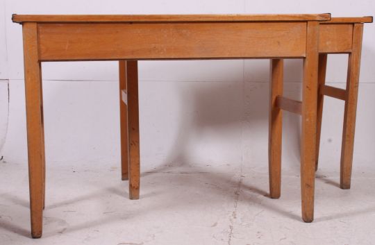 A good pair of 1950's beech wood double school desks. Both raised on tapered supports with twin hinged lift up desk tops. Measures: 71cm x 103cm x 42cm.
