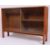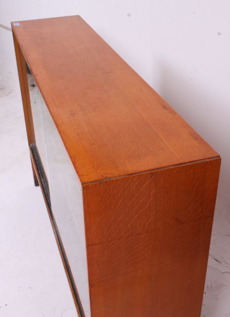 A mid 20th century Air Ministry style sliding glass window golden oak bookcase cabinet. Raised on squared legs together with a similar two tier side table. Measures: 79cm x 117cm x 28cm.