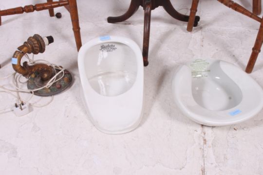 Two lots of vintage of ceramic by "Grimwades Douchpan" pans and a Gilt wood wall light together with a late century toilet mirror and a tripod side table.
