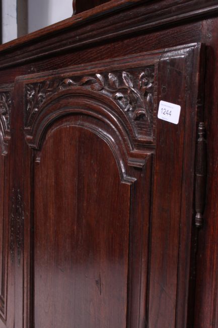 A 19th century carved oak large French dresser / buffet. Of provincial form having stile supports with twin door cupboard having solid oak doors. Above a flared top with large upright spindle gallery back. Dismantles into 2 sections. Measures: 232cm H 132cm W 60.5cm D