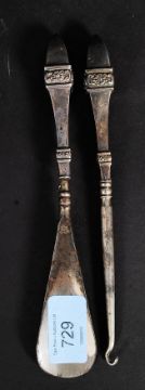 A hallmarked silver handled hook and eye set - the handles being of raised design with hallmarks to side. Weight: 87g.