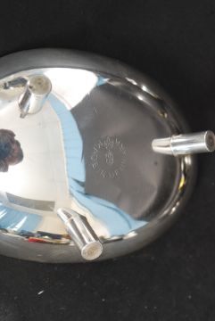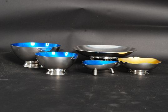 A collection of silver plated enamel wares x 4 along with a silver dish tazza all by Carl Christiansen of Denmark. Each piece marked with the CROWN CC mark along with FDG markings for Danish silver plate.