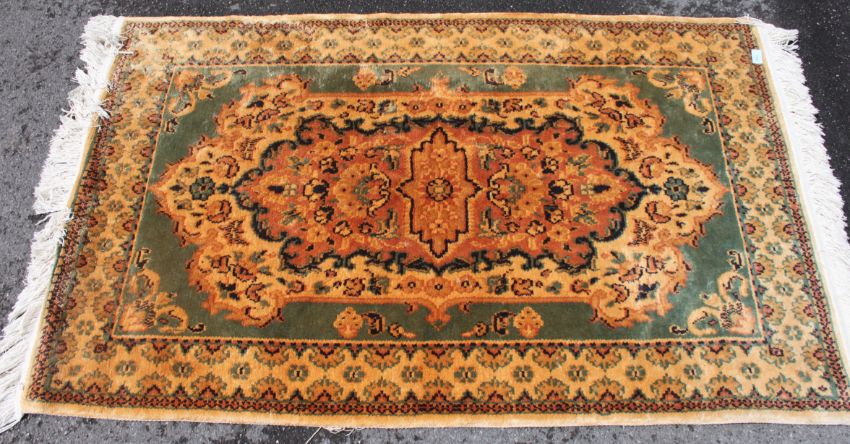 2 Persian style rugs with geometric patterns, one having a yellow ground, each with tassled ends ( see illustration ). Measures: 185cm x 83cm.
