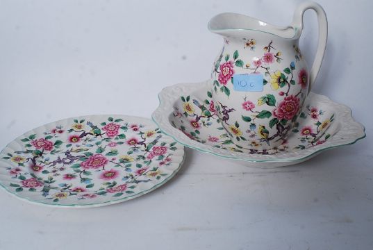 Three pieces of James Kent Staffordshire dressing table set pieces, Imari dish and a Staffordshire dressing table set. 16cms high