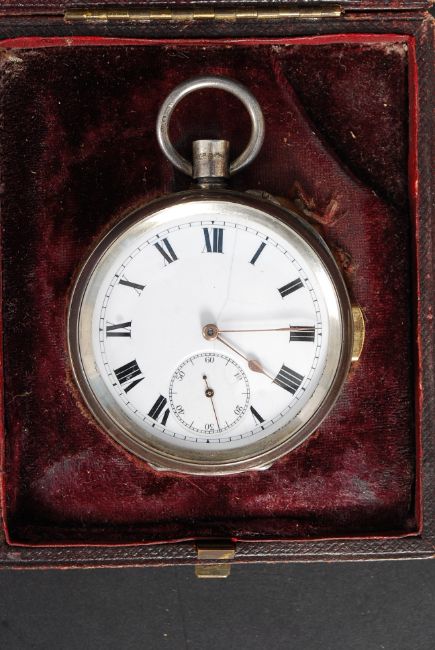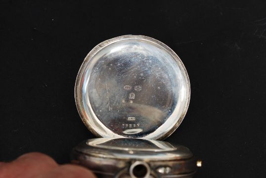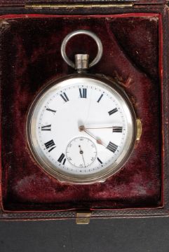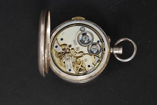 A silver 925 / date letter E marked open faced repeater pocket watch. Swiss made having white enamel dial with roman numerals and subsidiary seconds dial. The movement unsigned, cased marked GD, possibly George Day. Complete with Morrocco leather case. Total weight 101.7g