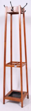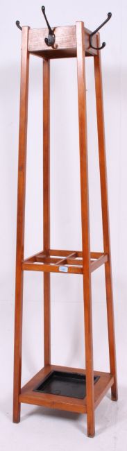 A 1950's school / industrial vintage squared base teak hook / coat rack and umbrella stand, of tapering form. Removable drip tray to base. Measures: 176cm x 39cm x 39cm.