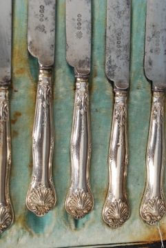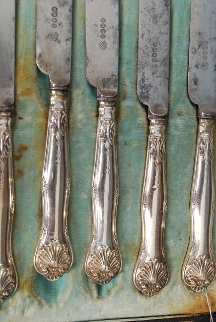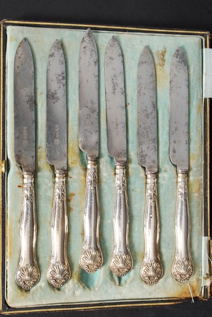 A silver handled hallmarked silver fruit knives, within a case. Weight: 134g.
