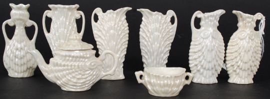A collection of eight ( 8 ) pieces of miniature lustre jugs, vases, tea pot etc. Some pieces matching each piece having a shell like appearance