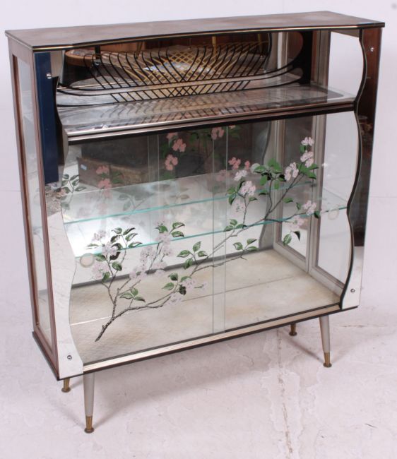 A 1950's retro mirror glass and formica china / ornament display cabinet. This fabulous example with mirror'd facia, sliding glass door cabinet with shelves within. Measures: 116cm x 104cm x 31cm.