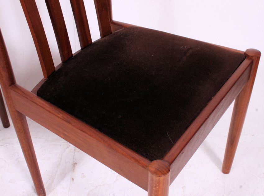 A set of 4 1970's teak wood retro dining chairs by Meredew having tapered supports with the original upholstery. Measures: 90cm x 49cm x 48cm.