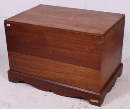 A good anglo - indian teak wood coffer - blanket box chest. Of heavy construction having plain panels, hinged top with plinth base. Measures: 63cm x 95cm x 65cm.