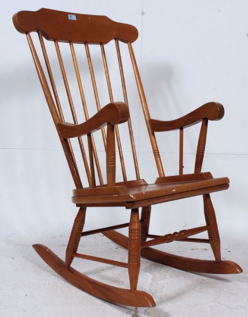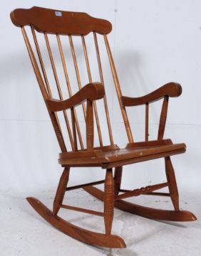 An antique style 20th century Windsor style rocking armchair raised on turned legs with sleigh runners having panel seat and tall back rest to the rear. Measures: 102cm x55cm x 75cm.