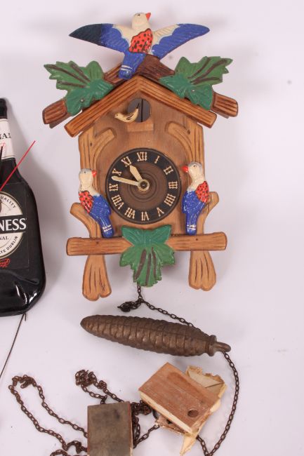 A collection of clocks to include a Swiss style Cuckoo clock, novelty Guinness clock and others.