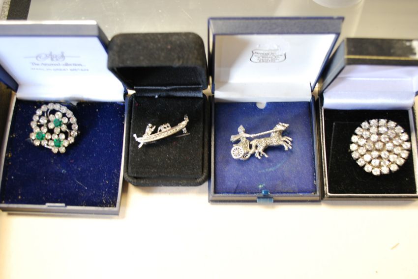 A collection of 4x silver and white metal ( 925 ) costume jewellery brooches, including one in the form of a Gondola, Emerald Green stone inset, Roman Chariot and another.