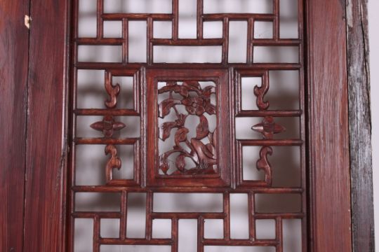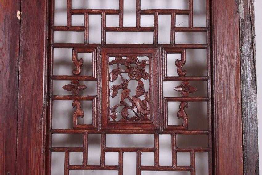A fabulous pair of 20th cenutry Chinese hardwood doors having recessed lower panels with fret pierced panels above complete with the door frame. Measures: 240cm x 136cm x 9cm.