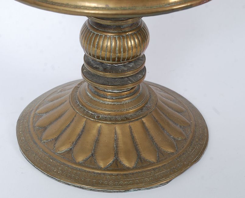 Unusual early 20th century middle eastern/ Indian/ Persian brass bowl, with ribbed fluted form on a cast base with flat bowl to top.