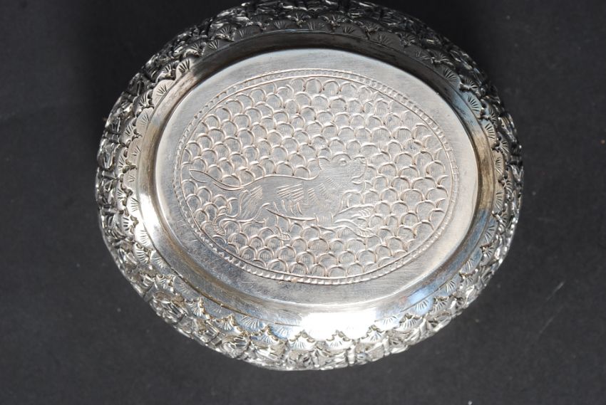 A 20th century Indian / Siam silver (unmarked white metal) asiatic finger bowl cast in relief having a scalloped edge (tests as silver). Weight 95.7g