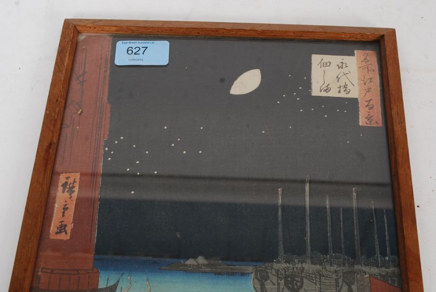 A Japanese woodblock print of a harbour scene bearing character marks to the corner and sides being framed and glazed. Measures 34cms x 22cms