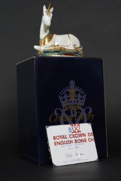 A Royal Crown Derby limited edition model of a Unicorn being specially designed to celebrate the new millennium by Louise Adams. Limited edition no 215/2000 complete with gold stopper and painted monogram having original box and certificate of authenticity. Purchased originally from Govier's of Sidmouth. 14cms high