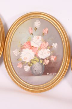 A 20th century set of three still life oil on board paintings of flower in vases. All set within gilt oval wooden frames. Measures 24 x 19 cm