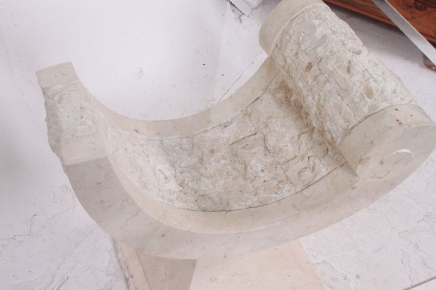 A contemporary marble lined and glass art sculpture side table. The shaped marble applied base of geometric form having bevelled glass top above. Measures: 56cm x 66cm x 66cm.