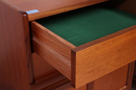 A retro Nathan teak wood corner cabinet having fielded panel twin doors with recessed plinth together with an upright Nathan side cabinet having single drawer over cupboard beneath. Measures: 75cm x 52cm x 46cm.