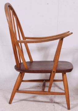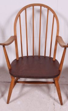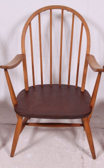 A set of 3 1970's Ercol windsor pattern armchairs having stub legs united by stretchers with panelled seats and arched back rests. Measures: 82cm x 60cm x 51cm.